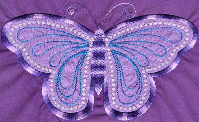 PLEASE READ: Secret for Success: Big, bold and beautiful, these designs will embellish quilt tops, jacket backs, tote bags, table linens, placemats, towels, pillow tops, skirts, pant legs, you name it! The applique is of varying width, giving these butterflies a sophisticated and elegant appearance. As you can see in the actual stitchouts below, I used varigated and metallic threads throughout and they sewed smoothly. Roberta's rendition of these designs is shown below also to give you further inspiration as to color themes. These are designed for the 5x7 inch hoop. Creatively yours, Wendy |