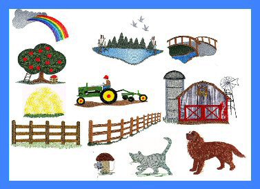 I developed this set to compliment the Applique farm animals, but as you can see, it is full of creative ideas just by itself. The barn and apple tree are applique - full instructions included. Have fun with it, and I would love to see how you put the designs together, so email me some jpegs, please!